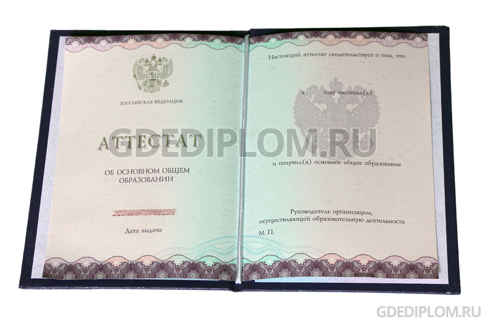 Продажа школьных аттестатов за 9 класс любой школы Москвы и других городов России. Ниже представлены образцы бланков аттестатов об основном общем образовании. Документы изготавливаются на защищенных подлинных бланках (Гознак). В комплекте: оригинальный бланк аттестата за 9 класс, вкладыш (приложение), твердая обложка. Заполнение по государственным стандартам с настоящей печатью школы, подписями директора и других ответственных лиц. Подходят для поступления в техникумы, колледжи и училища, принимающие на базе 9 классов!